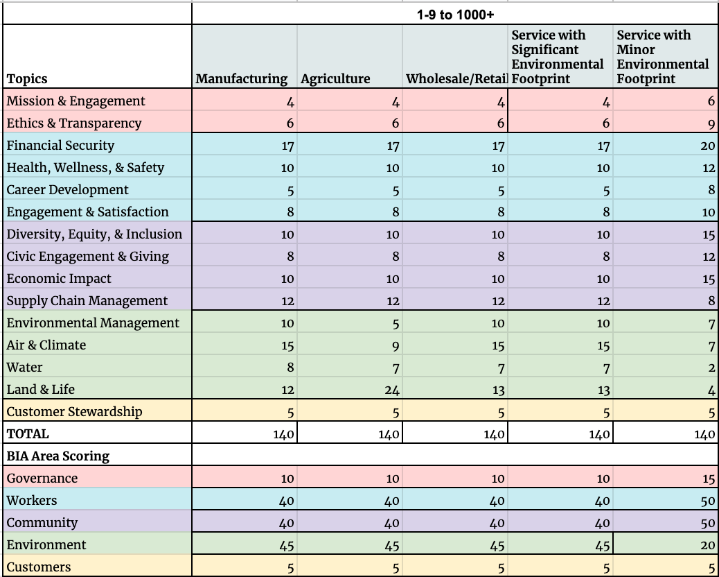The B Impact Assessment (BIA) comprises five categories: governance, workers, community, environment, and customers. A company must achieve at least 80 points out of 200 to pass the assessment. The test is administered through filling out questionnaires, computing company statistics, reporting on company standards, and supporting company claims.